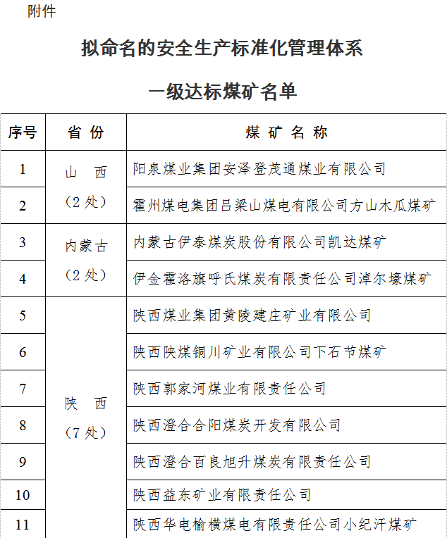 附件:擬命名的安全生產(chǎn)標(biāo)準(zhǔn)化管理體系一級達標(biāo)煤礦名單