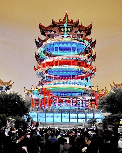 △10月7日晚,來自全國各地的抗疫英雄、游客及武漢市民在黃鶴樓前觀看大型實景光影秀《夜上黃鶴樓》