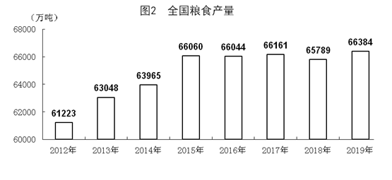 全年全國糧食總產(chǎn)量66384萬噸,比上年增長0.9%,增產(chǎn)594萬噸,連續(xù)5年保持在65000萬噸以上。其中,夏糧產(chǎn)量14160萬噸,增長2.0%;早稻產(chǎn)量2627萬噸,下降8.1%;秋糧產(chǎn)量49597萬噸,增長1.1%。分品種看,小麥產(chǎn)量13359萬噸,增長1.6%;玉米產(chǎn)量26077萬噸,增長1.4%;大豆產(chǎn)量1810萬噸,增長13.3%。全年豬牛羊禽肉產(chǎn)量7649萬噸,比上年下降10.2%。其中,牛肉產(chǎn)量667萬噸,增長3.6%;羊肉產(chǎn)量488萬噸,增長2.6%;禽肉產(chǎn)量2239萬噸,增長12.3%;禽蛋產(chǎn)量3309萬噸,增長5.8%;牛奶產(chǎn)量3201萬噸,增長4.1%;豬肉產(chǎn)量4255萬噸,下降21.3%。