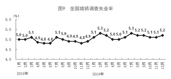 全年城鎮(zhèn)新增就業(yè)1352萬人,連續(xù)7年保持在1300萬人以上,明顯高于1100萬人以上的預(yù)期目標,完成全年目標的122.9%。12月份,全國城鎮(zhèn)調(diào)查失業(yè)率為5.2%,2019年各月全國城鎮(zhèn)調(diào)查失業(yè)率保持在5.0%-5.3%之間,實現(xiàn)了低于5.5%左右的預(yù)期目標。全國主要就業(yè)人員群體25-59歲人口調(diào)查失業(yè)率為4.7%。12月份,31個大城市城鎮(zhèn)調(diào)查失業(yè)率為5.2%。2019年末,城鎮(zhèn)登記失業(yè)率為3.62%,比上年末降低0.18個百分點,符合4.5%以內(nèi)的預(yù)期目標。年末全國就業(yè)人員77471萬人,其中城鎮(zhèn)就業(yè)人員44247萬人。全年農(nóng)民工總量29077萬人,比上年增加241萬人,增長0.8%。其中,本地農(nóng)民工11652萬人,增長0.7%;外出農(nóng)民工17425萬人,增長0.9%。農(nóng)民工月均收入水平3962元,比上年增長6.5%。