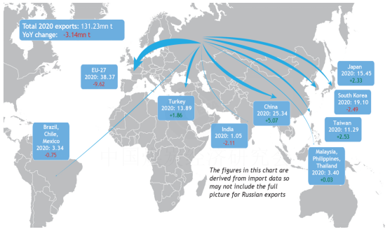2020年,俄羅斯煤炭出口與上年基本持平。主要是7月-12月強(qiáng)勁的煤炭出口扯平了上半年的出口疲弱,遠(yuǎn)東和南部港口增加的煤炭出口對(duì)沖了西北波羅的海沿岸港口煤炭出口的下滑。據(jù)外媒消息,2020年俄羅斯海運(yùn)煤炭出口1.9億噸,略高于2019年的1.89億噸和2018年的1.822億噸。
