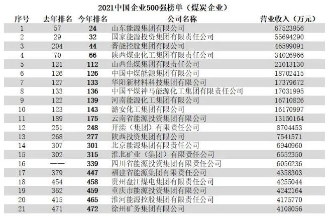 今年共有21家煤炭企業(yè)上榜。其中,山東能源集團(tuán)有限公司、國(guó)家能源投資集團(tuán)有限責(zé)任公司、晉能控股集團(tuán)有限公司、陜西煤業(yè)化工集團(tuán)有限責(zé)任公司入圍榜單前100名。四川省能源投資集團(tuán)有限責(zé)任公司為新上榜企業(yè)。有8家企業(yè)排名較去年有所提升,11家企業(yè)排名下降,1家企業(yè)排名持平。
