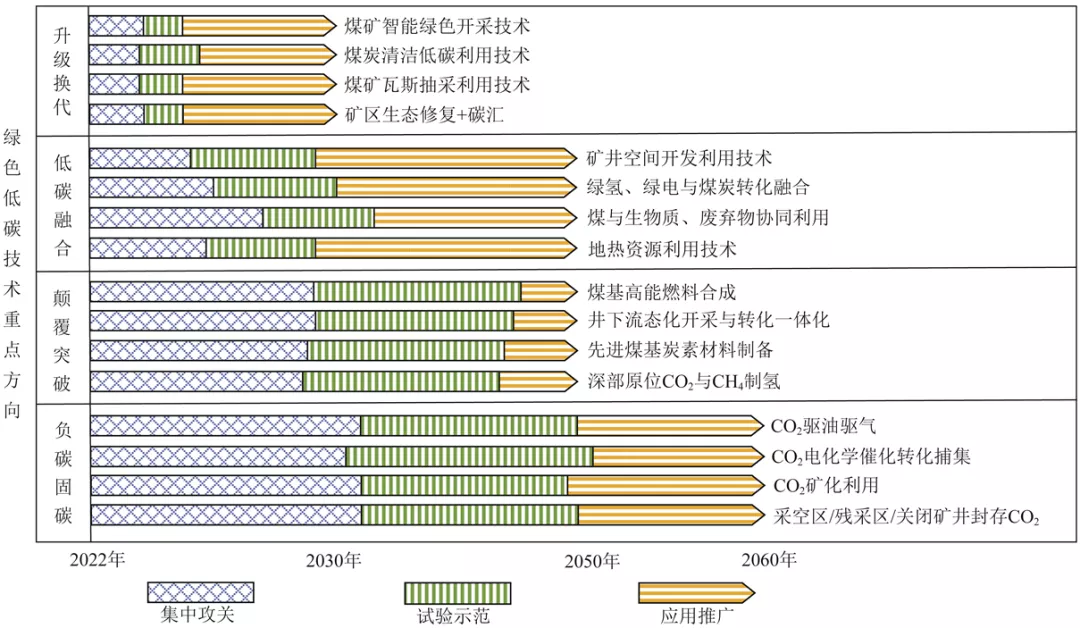 創(chuàng)新綠色低碳技術不僅是當前煤炭行業(yè)轉(zhuǎn)型發(fā)展的需要,也是國際競爭的熱點。結(jié)合短期與中長期目標,統(tǒng)籌穩(wěn)增長與調(diào)結(jié)構(gòu),圍繞升級換代、低碳融合、顛覆突破、負碳固碳四大技術類型,提出煤炭未來的綠色低碳科技創(chuàng)新重點方向。根據(jù)煤炭行業(yè)綠色低碳技術發(fā)展現(xiàn)狀與態(tài)勢,現(xiàn)有低碳升級技術在2025年左右可實現(xiàn)規(guī)模化應用推廣。2025年前,主要進行低碳融合技術與負碳技術的攻關;2025—2030年,開展技術試驗與示范,并根據(jù)技術成熟度和減碳需求適時規(guī)?;瘧猛茝V;2030年前,主要目標是完成重大顛覆突破技術的集中攻關和試驗示范;2030年后,取得突破的技術進行規(guī)模應用,實現(xiàn)大規(guī)模減碳,為2060年實現(xiàn)碳中和奠定基礎。
