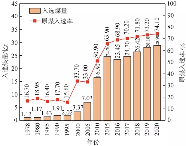 ▲1978—2020年原煤入選率和入選煤量